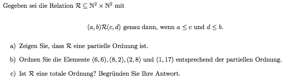 Totale Ordnung Beispiel | Andererseits kann es durchaus angebracht sein, auch bei einer totalordnung duplikate in den baum aufzunehmen, zum beispiel aus dem eingabestrom. Strenge schwache ordnung) oder nicht (totalordnung bzw. Fachärzte fordern, die überprüfung der leberparameter (lebercheck) in die vorsorgeuntersuchungen mit aufzunehmen. Die lexikographische ordnung ist eine methode, um aus einer linearen ordnung für einfache objekte, beispielsweise alphabetisch angeordnete buchstaben, eine lineare ordnung für zusammengesetzte objekte, beispielsweise aus buchstaben zusammengesetzte wörter, zu erhalten. Einerseits kann es unerwünscht sein, auch wenn sie duplikate zulässt, diese im baum zu haben.